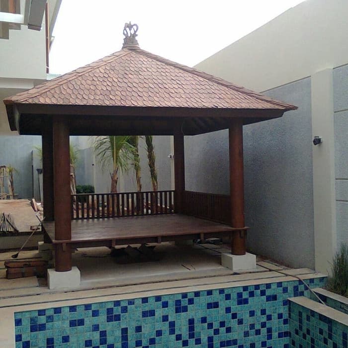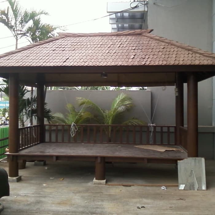 • Gazebo kayu kelapa : Gazebo kayu kelapa itu semua bahan yang di pakai terbuat dari kayu kelapa dan beratap sirap, gazebo jenis ini merupakan gazebo yang mempunyai kualitas baik karena tahan terhadap rayap dan dapat bertahan lama hingga puluhan tahun. Dengan adanya gazebo kayu kelapa di rumah dapat menambah keindahan suatu taman dan terlihat lebih elegan, Harganya pun cukup mahal namun sesuai dengan kualitas dari bahan yang di pakainya tersebut.