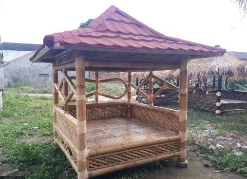 • Gazebo Bambu : Gazebo bambu yaitu gazebo yang bahan-bahannya semua terbuat dari bambu dan mempunyai 3 jenis atap yang bisa di pakai sesuai selera dan keinginan konsumen, atapnya terdiri dari : atap injuk, atap ilalang atau kiray, dan atap genteng metal. Gazebo bambu juga tidak kalah bagusnya dengan gazebo kayu kelapa meskipun semua bahan terbuat dari bambu namun mempunyai kualitas yang cukup baik dan tahan berpuluh-puluh tahun meskipun sering kepanasan dan kehujanan. Gazebo jenis ini ada yang terbuat dari bambu hitam dan ada juga yang terbuat dari bambu petung, kedua jenis bambu ini sama-sama memiliki kualitas yang bagus hanya berbeda pada ukurannya saja yaitu bambu hitam memiliki ukuran yang lebih kecil dari pada bambu petung / andong.